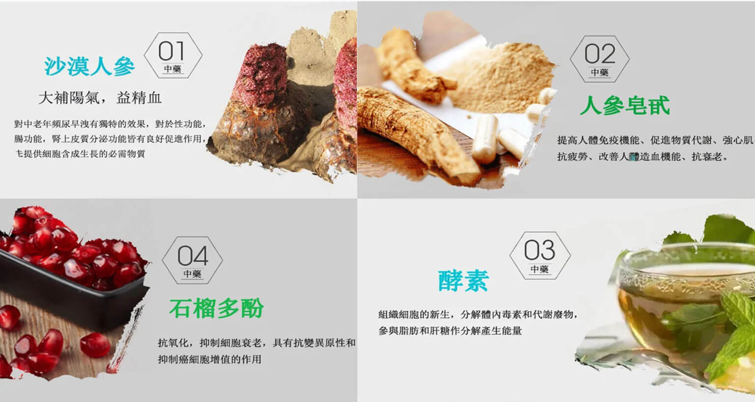 • 成分:沙漠人參、鎖陽、石榴多酚、人參皂苷、水果酵素