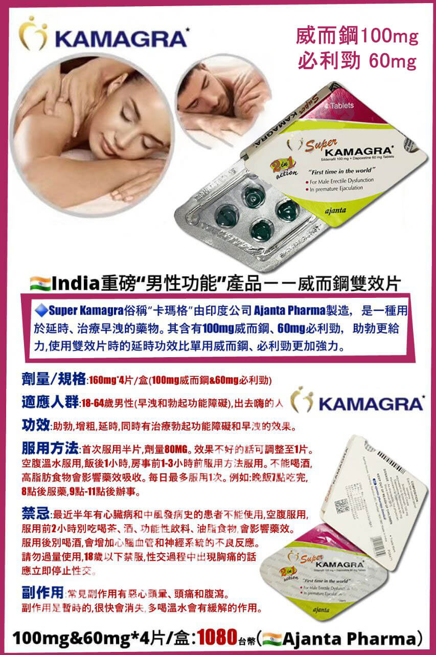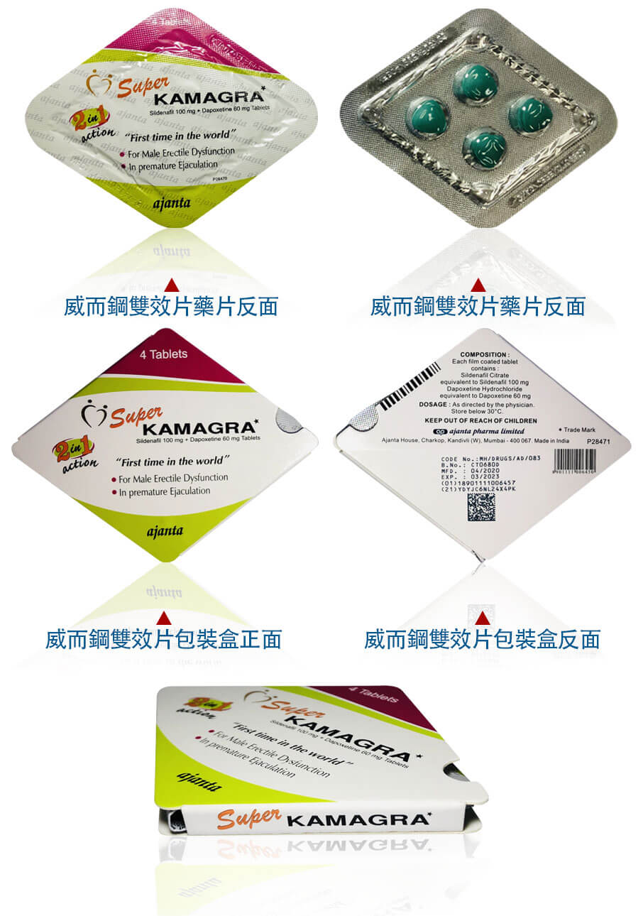 印度進口Super KAMAGRA雙效威而鋼含有西地那非100mg + 達泊西汀60mg,具有助勃+延時雙重功效,副作用低微,對男性早洩和勃起障礙的改善效果非常好!正品有保證擺脫早洩不舉一顆就可以滿足你!
